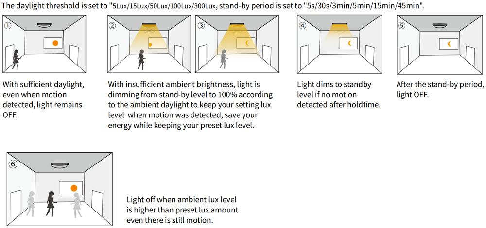 MC004-S02R bol postavený v režime dvoch fotografií. Technológia senzora na rozlíšenie prirodzeného svetla a umelého svetla LED, takže senzor dynamicky stlmí vaše svietidlo podľa okolitého slnečného svetla. Keď je detekovaný pohyb, keď stúpa slnečné svetlo, svietidlo sa stlmí. Keď slnečné svetlo klesá, svietidlo je otočené nahor. Tento mechanizmus na vyváženie prirodzeného a umelého svetla šetrí vašu energiu, no zachováva potrebnú úroveň luxov.