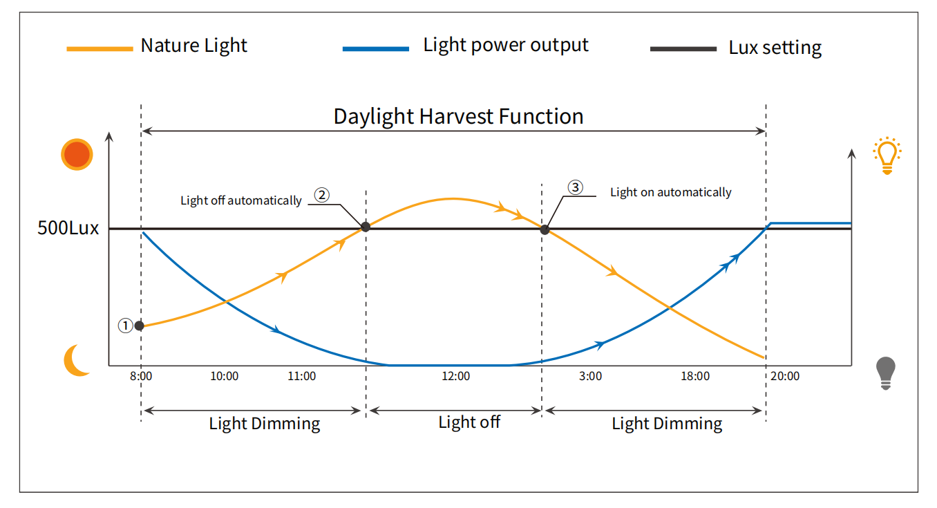 Daylight Harvesting – Automaticky sníma intenzitu okolitého svetla a dynamicky upravuje jas lámp, aby sa optimalizovala spotreba energie;