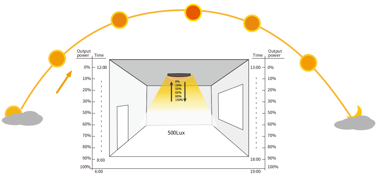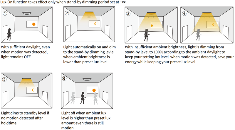 Keď senzor zaznamená prirodzené svetlo, stlmí svetlo, svietidlo stlmí výstup, ako je uvedené nižšie: