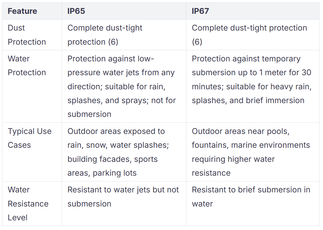 Pri výbere LED osvetlenia odolného voči poveternostným vplyvom sa zamerajte na jeho vodotesnosť. Hodnotenie IP ukazuje, ako dobre svetlo chráni pred prachom a vodou. Pre väčšinu vonkajších miest si vyberte svetlá s krytím aspoň IP65. Toto hodnotenie blokuje všetok prach a chráni pred dažďom alebo postriekaním. Ak žijete v blízkosti oceánu alebo máte svetlá pri bazénoch, potrebujete silnejšiu ochranu. Svietidlá IP67 zvládnu aj krátkodobý pobyt pod vodou. Sú dobré pre mokré alebo morské oblasti.