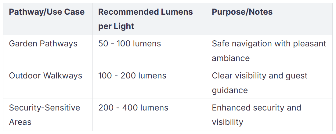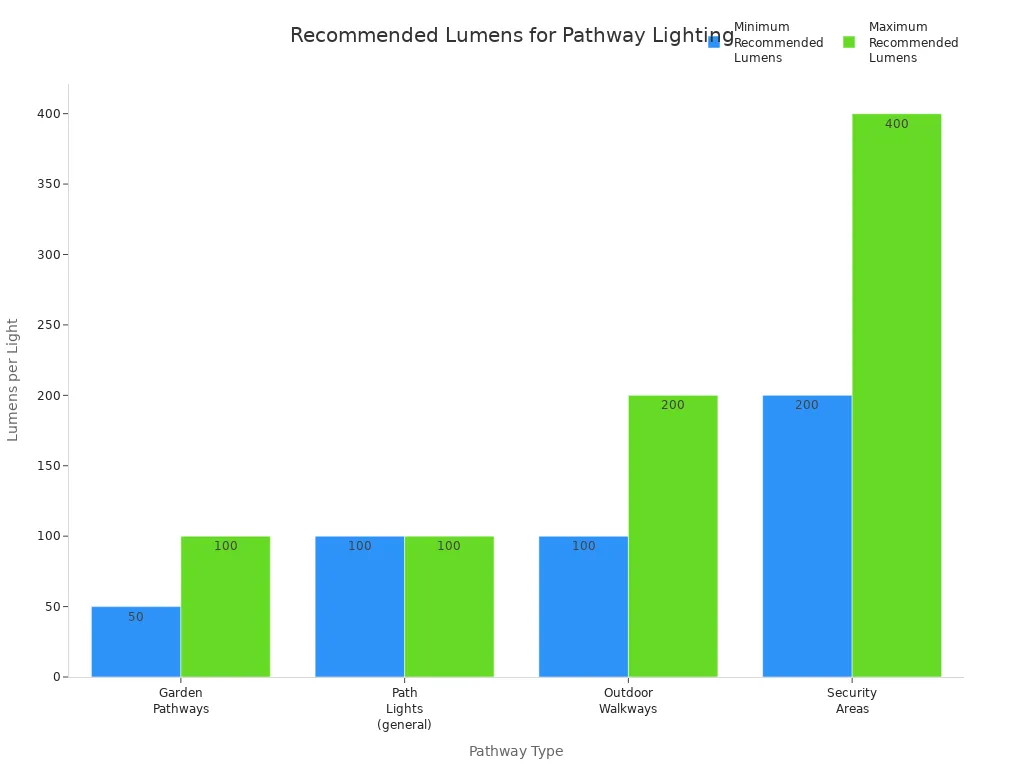 Dôležité je mať vonku bezpečné cesty. Osvetlenie chodníkov pomáha ľuďom vidieť, kam ísť. Zastaví tiež zakopnutia a pády. Pre záhradné chodníky používajte svetlá s 50–100 lúmenmi. Chodníky potrebujú na dobré svetlo 100 – 200 lúmenov. Ak chcete väčšiu bezpečnosť, použite 200 – 400 lúmenov na svetlo. Pre rovnomerné svetlo umiestnite vonkajšie LED svetlá 6–8 stôp od seba. Úzke cesty potrebujú svetlá bližšie k sebe. Široké cesty môžu mať svetlá ďalej od seba. Umiestnite svetlá asi 14 palcov nad zemou. To dáva priamy lúč a cesta vyzerá pekne.