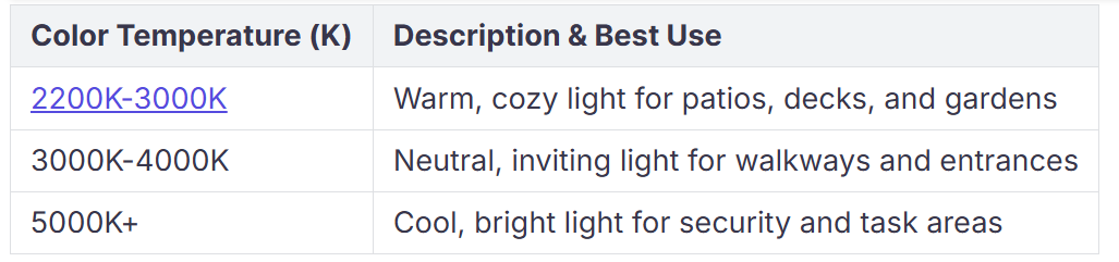 Výber správnej farebnej teploty zmení pocit a fungovanie vášho priestoru. Teplé svetlo, od 2200K do 3000K, robí miesta útulnými a príjemnými. Použite ho na terasy, terasy alebo záhrady, kde si chcete oddýchnuť alebo sa zabaviť s priateľmi. Neutrálna biela, medzi 3 000 K a 4 000 K, poskytuje jasné svetlo, ktoré nie je príliš jasné. To je dobré pre chodníky a vchody, takže budete dobre vidieť bez toho, aby ste si poranili oči. Studená biela, nad 5000 K, je veľmi jasná a ostrá. Použite to na bezpečnostné osvetlenie alebo miesta, kde potrebujete všetko jasne vidieť.
