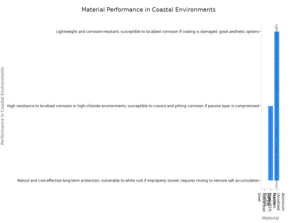 Výrobcovia používajú povrchovú úpravu práškovým lakom a utesnené kryty, aby svetlá vydržali dlhšie. Tieto funkcie pomáhajú LED osvetleniu odolnému voči poveternostným vplyvom prežiť búrky, vlhký vzduch a soľnú hmlu. Ako fungujú rôzne materiály v blízkosti mora, môžete vidieť v tabuľke nižšie: