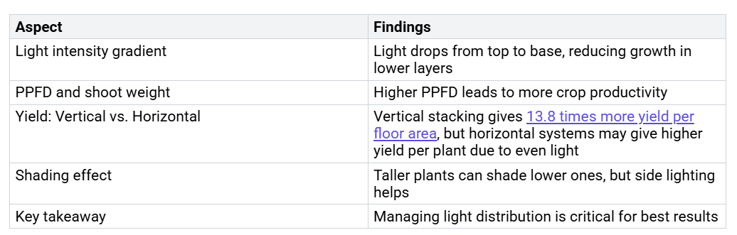 Vidíte jasné dôkazy z vedeckých štúdií, že vertikálne pestovateľské svetlá môžu transformovať rast rastlín a výnosy. Výskumníci merali, ako sa mení intenzita svetla od vrchu po spodok vertikálnych stĺpcov. Zistili, že nižšie vrstvy často dostávajú menej svetla, čo môže obmedziť rast. Keď však použijete bočné alebo presvetľovacie stratégie, môžete zvýšiť expozíciu svetla pre všetky vrstvy a zvýšiť produktivitu.