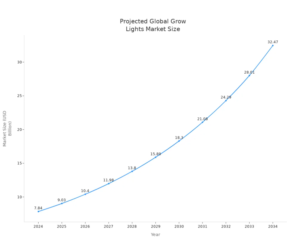 Áno, vertikálne pestovateľské svetlá môžu pomôcť vašim rastlinám lepšie rásť. Vidíšrýchle zmeny vo vnútornom záhradníctvečím viac ľudí používa pokročilé pestovateľské svetlá na zlepšenie rastu rastlín. Nedávne trendy to ukazujúvertikálne poľnohospodárstvo v regiónoch ako Severná Amerika a Ázia a Tichomoriespolieha na technológiu LED pre efektívnu, celoročnú výrobu. Nové riešenia, ako napríklad FANXSTAR Vfarm V30, ponúkajú energetickú účinnosť a prispôsobiteľné možnosti, vďaka čomu sú vertikálne pestovateľské svetlá nevyhnutné pre moderných pestovateľov.